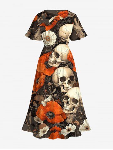 Plus Size Skull Flower Print Hawaii Split Pocket A Line Midi Dress - Orange - L