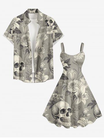Plus Size Skull Flowers Leaf Print Hawaii Tank Dress - Dark Gray - Xs