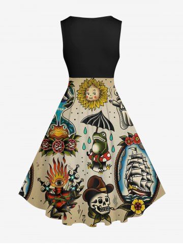 Plus Size Skull Frog Sunflowers Ship Cruise Print 1950s Hawaii Vintage Dress - Black - L