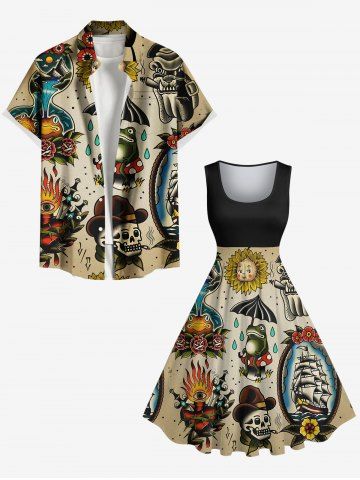 Graphic Dresses > Plus Size Skull Frog Sunflowers Ship Cruise Print 1950s Hawaii Vintage Dress