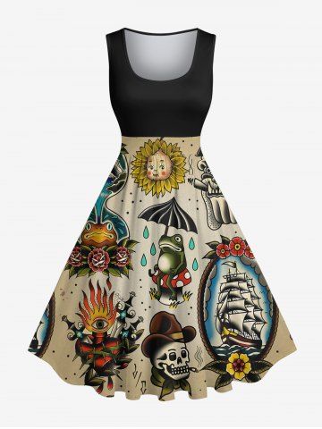 Plus Size Skull Frog Sunflowers Ship Cruise Print 1950s Hawaii Vintage Dress - Black - 3x