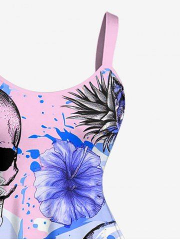 Plus Size Skull Hibiscus Flower Pineapple Paint Splatter Print Hawaii Tank Dress - Pink - 4x