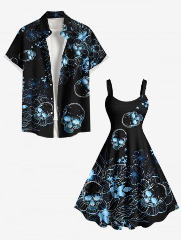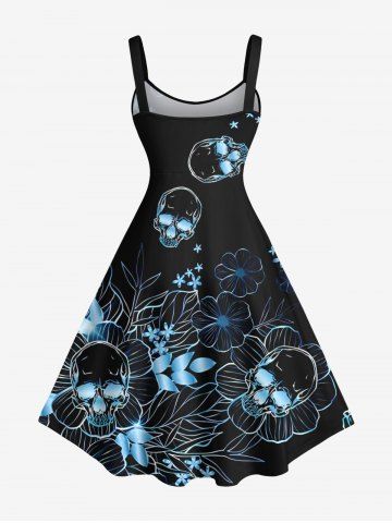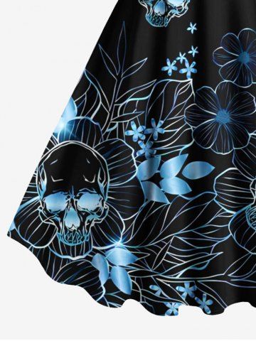 Plus Size Skull Leaf Flower Print Halloween Costume A Line Tank Dress - Black - 1x