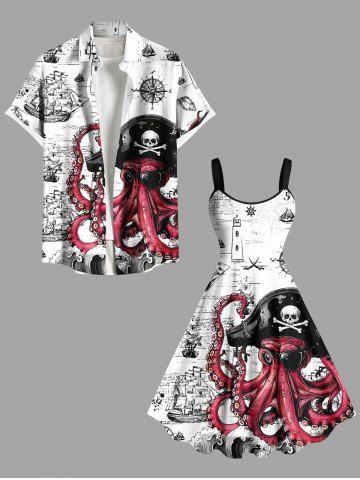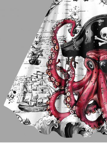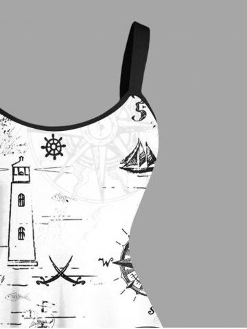 Plus Size Skull Octopus Pirate Sailboat Print Hawaii Cruise A Line Tank Dress - White - 2x