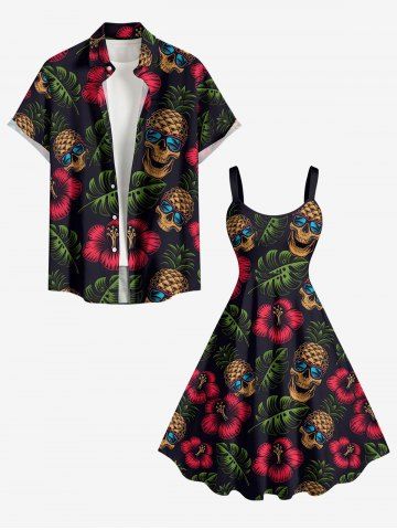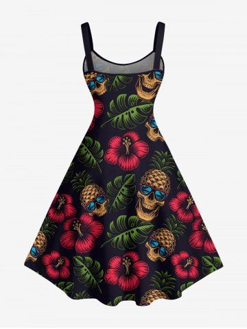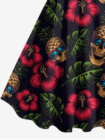 Plus Size Skull Pineapple Hibiscus Flower Tropical Leaf Print Hawaii Tank Dress - Black - M