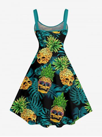 Plus Size Skull Pineapple Tropical Leaf Print Hawaii A Line Dress - Deep Green - M