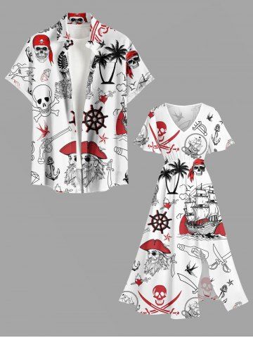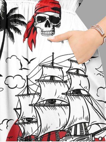 Plus Size Skull Pirate Coconut Tree Rudder Anchor Sailboat Print Hawaii Split A Line Midi Dress - White - 5x