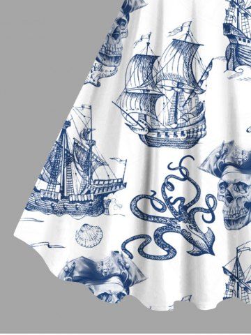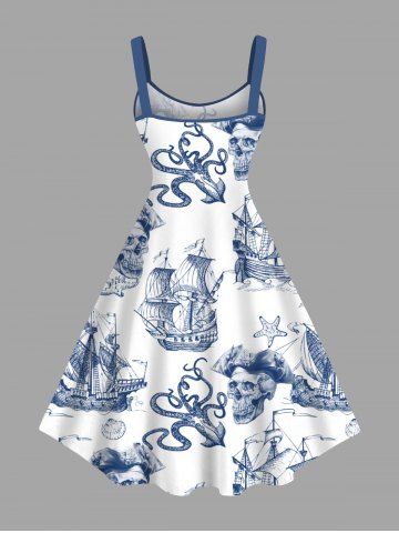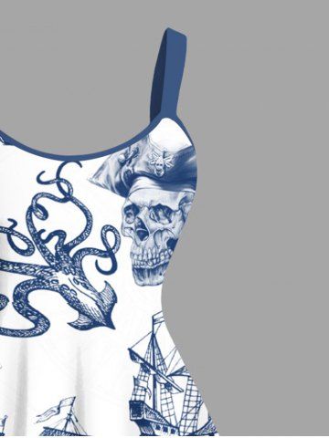 Plus Size Skull Pirate Octopus Sailboat Shell Print Hawaii Cruise A Line Tank Dress - White - 2x
