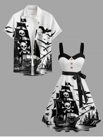 Plus Size Skull Pirate Sailboat Bird Print Hawaii Cruise Button A Line Dress with Removable Belt - White - 3x