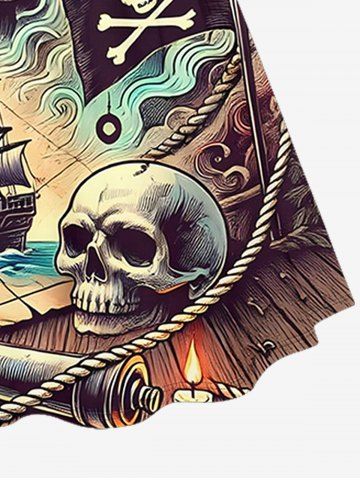 Plus Size Skull Pirate Sailboat Sea Waves Print Hawaii Cruise Cinched A Line Dress - Black - Xs