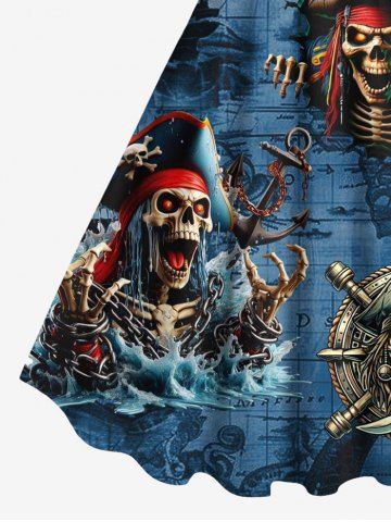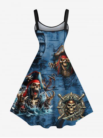 Plus Size Skull Pirate Sea Waves Sailboat Print Hawaii Cruise Ombre A Line Tank Dress - Blue - 3x
