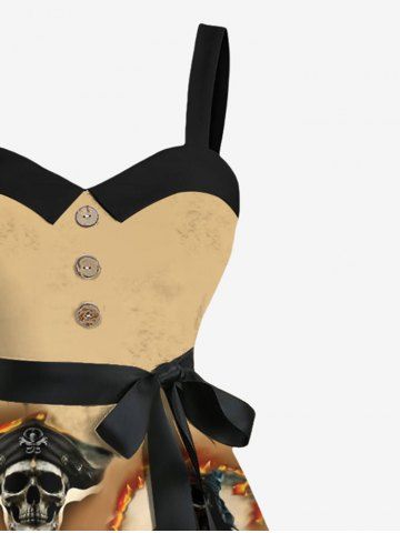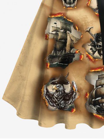 Plus Size Skull Pirate Ship Eagle Fire Flame Ripped 3D Print Buttons Turn Down Collar Hawaii Dress With Belt - Coffee - 2x