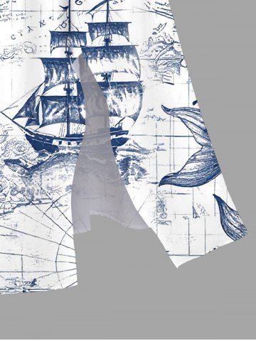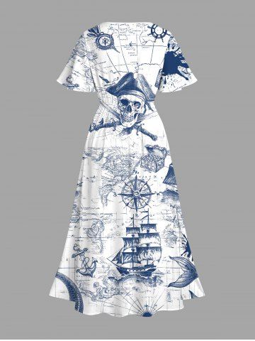 Plus Size Skull Pirate Ship Rudder Map Cruise Print Split Hawaii Midi Dress - Blue - M