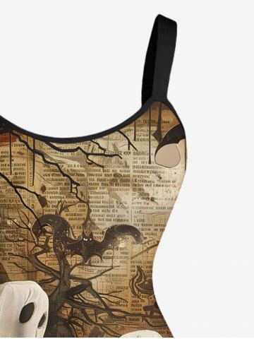 Plus Size Skull Pumpkin Spider Web Cat Ghost Bat Distressed Newspaper Print Halloween A Line Tank Dress - Brown - 2x
