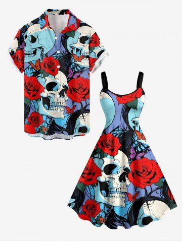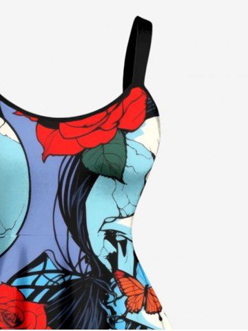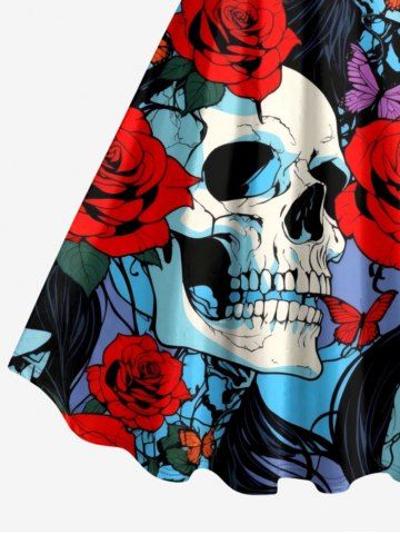 Plus Size Skull Rose Flower Butterfly Print A Line Dress - Red - S