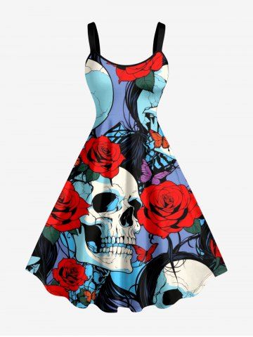 Graphic Dresses > Plus Size Skull Rose Flower Butterfly Print A Line Dress