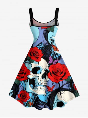 Plus Size Skull Rose Flower Butterfly Print A Line Dress - Red - M