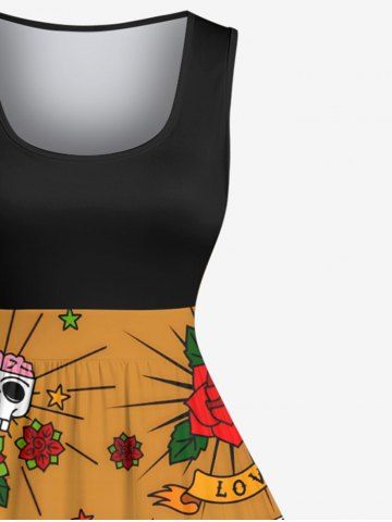 Plus Size Skull Rose Flower Heart Wing Print Hawaii 1950s Vintage Swing A Line Dress - Black - L