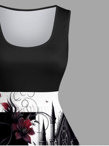 Plus Size Skull Rose Flower Ink Painting Castle Letter Print Vintage Swing A Line Dress - Black - L