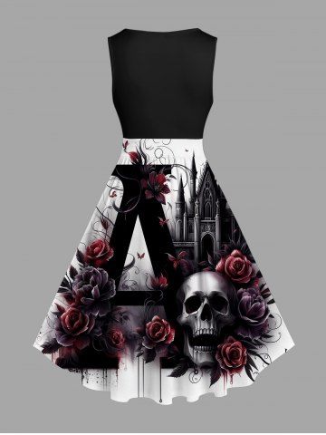 Plus Size Skull Rose Flower Ink Painting Castle Letter Print Vintage Swing A Line Dress - Black - 4x