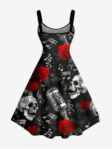 Plus Size Skull Rose Flower Microphone Music Symbol Print A Line Dress - Black - 2x
