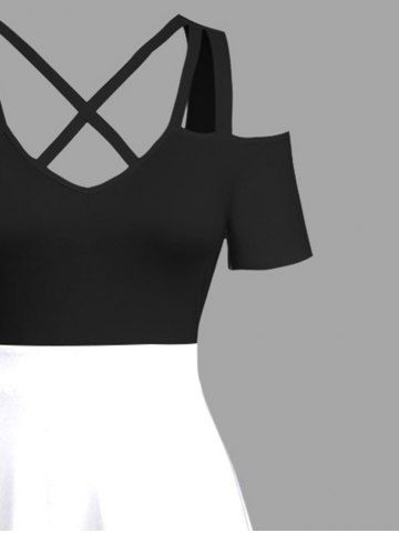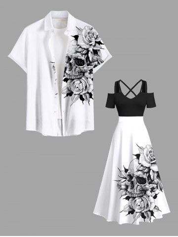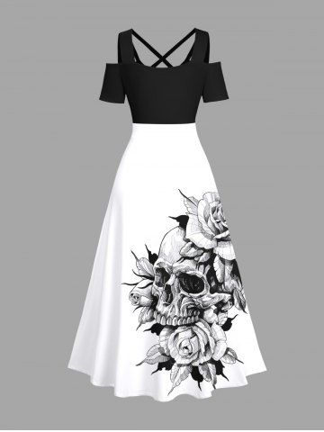 Plus Size Skull Rose Flower Print Cold Shoulder Crisscross Maxi Dress - White - S