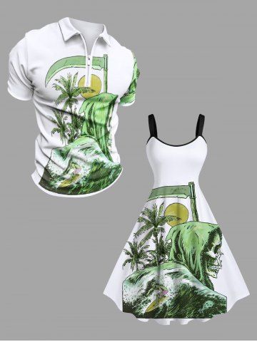 Plus Size Skull Sea Wave Surfer Coconut Tree Sun Scythe Print Hawaii A Line Tank Dress - White - 1x