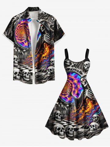 Plus Size Skull Skeleton Checkerboard Spiral Galaxy Fire Flame Print Halloween A Line Tank Dress - Black - Xs