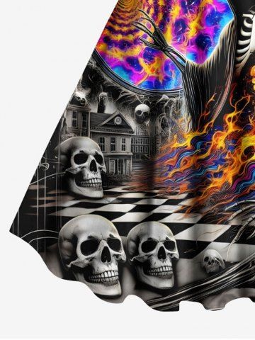 Plus Size Skull Skeleton Checkerboard Spiral Galaxy Fire Flame Print Halloween A Line Tank Dress - Black - 2x