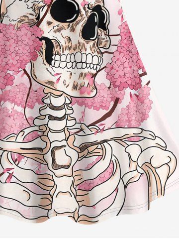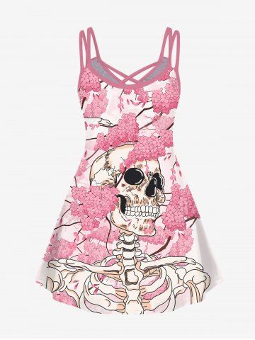 Plus Size Skull Skeleton Flowers Branch Print Crisscross Cami Dress - Light Pink - 1x