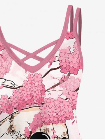Plus Size Skull Skeleton Flowers Branch Print Crisscross Cami Dress - Light Pink - 3x