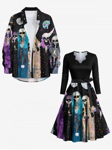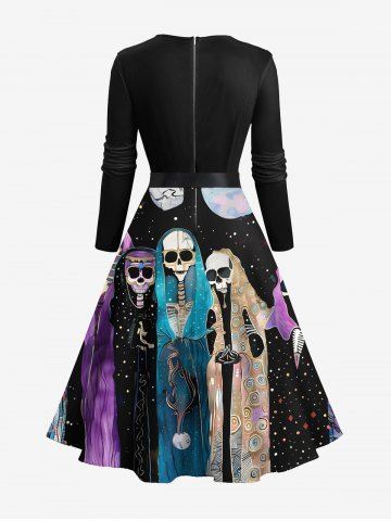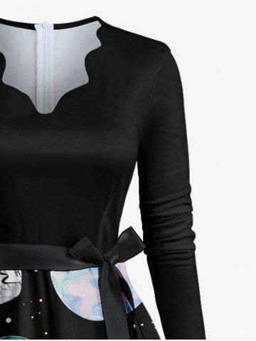 Plus Size Skull Skeleton Moon Planet Galaxy Print Scalloped Neck A Line Dress with Tied Belt - Black - Xl