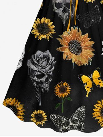 Plus Size Skull Sunflower Butterfly Print Cinched Hawaii Dress - Black - 4x