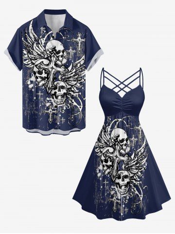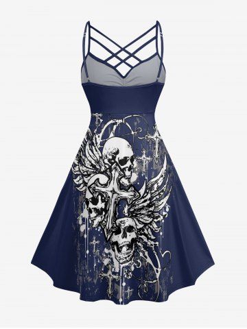 Plus Size Skull Wings Cross Print Ruched Lattice Crisscross Straps Dress - Deep Blue - L