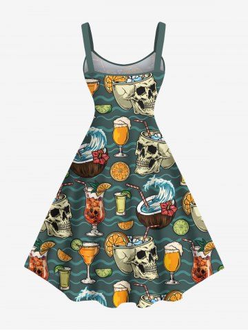 Plus Size Skulls Coconut Orange Juice Flowers Print Hawaii Tank Dress - Green - 2x