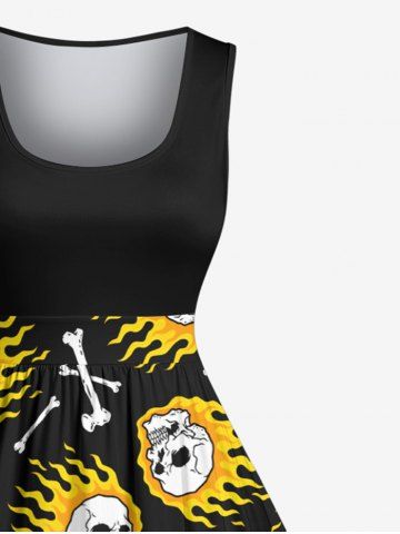 Plus Size Skulls Fire Flame Print 1950s Vintage Hawaii Dress - Black - S
