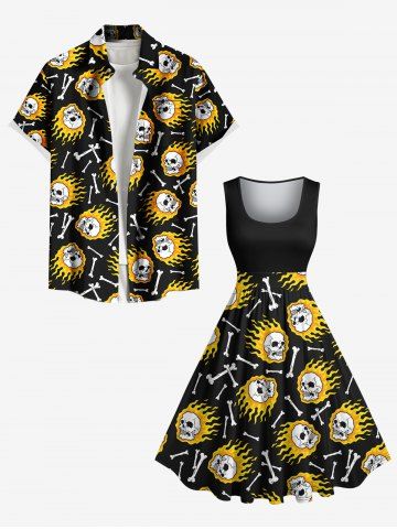 Plus Size Skulls Fire Flame Print 1950s Vintage Hawaii Dress - Black - 3x