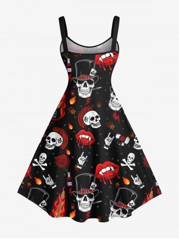 Plus Size Skulls Fireflame Guitar Lips Rose Flower Print Tank Dress - Black - Xxs