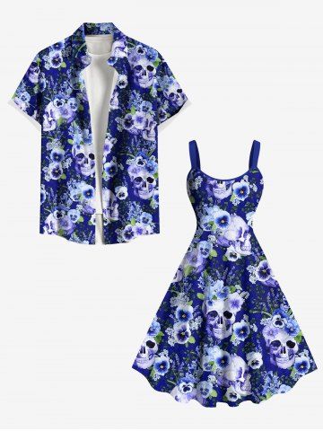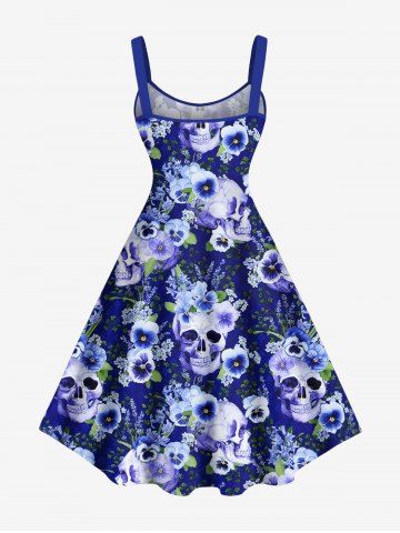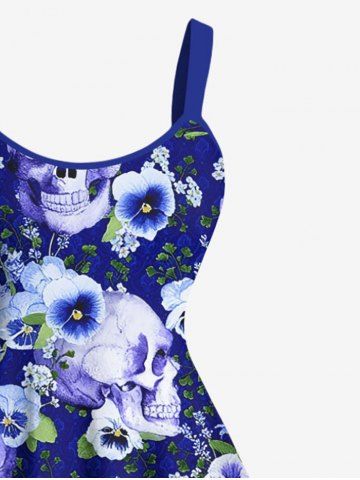 Plus Size Skulls Flower Leaf Print Hawaii Tank Dress - Blue - 2x
