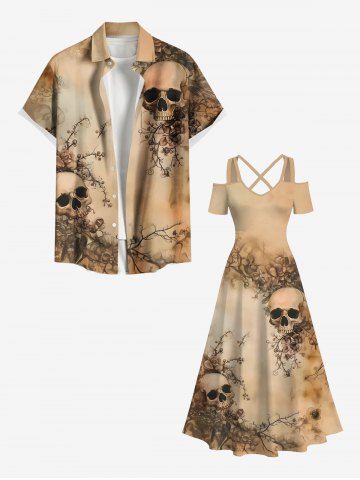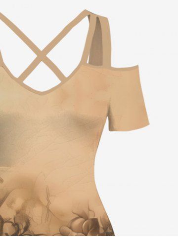 Plus Size Skulls Flowers Leaf Print Cold Shoulder Crisscross Hawaii Maxi Dress - Coffee - 1x