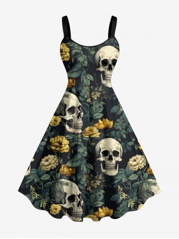 Graphic Dresses > Plus Size Skulls Flowers Leaf Print Hawaii Tank Dress