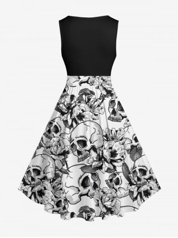 Plus Size Skulls Flowers Print 1950s Vintage Hawaii Dress - Black - 5x