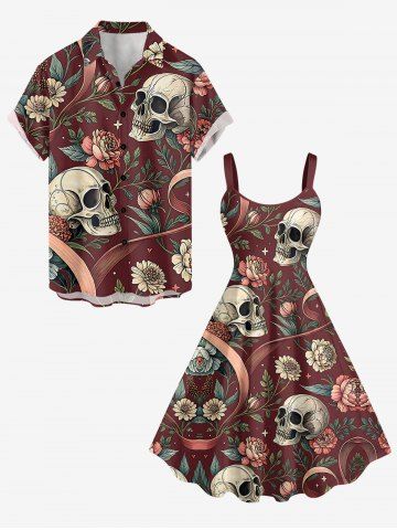 Plus Size Skulls Flowers Print Hawaii Tank Dress - Red Wine - Xs