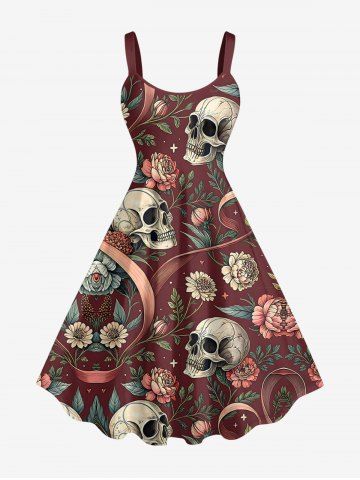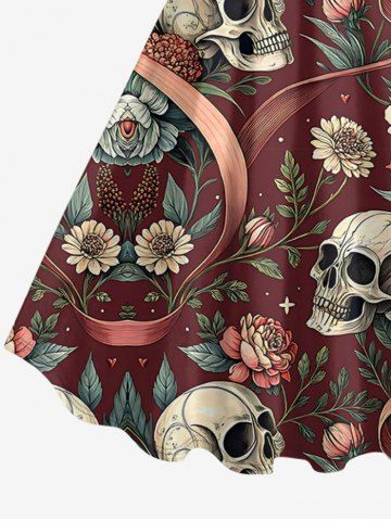 Plus Size Skulls Flowers Print Hawaii Tank Dress - Red Wine - 4x