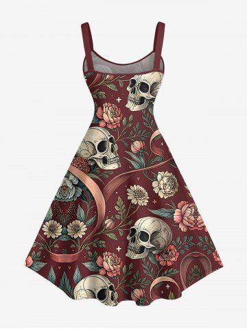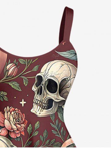Plus Size Skulls Flowers Print Hawaii Tank Dress - Red Wine - 5x