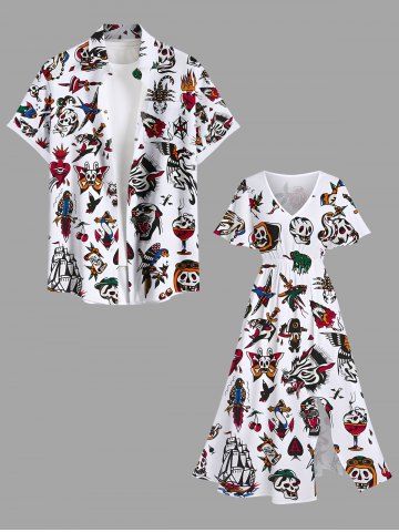 Plus Size Skulls Heart Ship Frog Scorpion Ice Cream Cruise Print Split Midi Dress - White - 2x