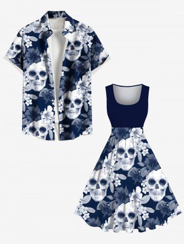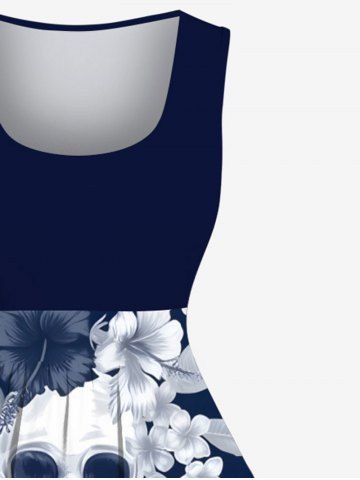 Plus Size Skulls Hibiscus Flower Leaf Print Hawaii 1950s Vintage Dress - Midnight Blue - 1x