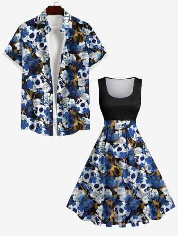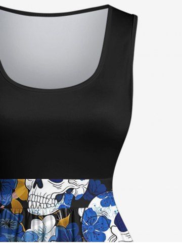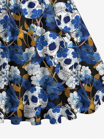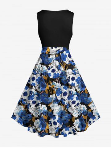Plus Size Skulls Ink Flower Print 1950s Vintage Swing A Line Dress - Black - Xs