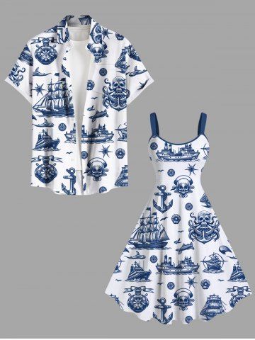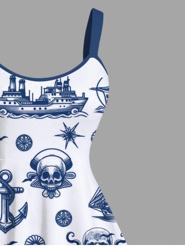 Plus Size Skulls Pirate Ship Anchor Cruise Print Hawaii Tank Dress - White - M