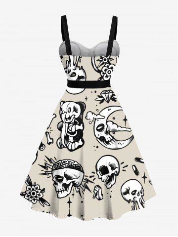 Plus Size Skulls Rose Flower Moon Diamond Print Buttons Turn Down Collar Hawaii Dress With Belt - Beige - 2x